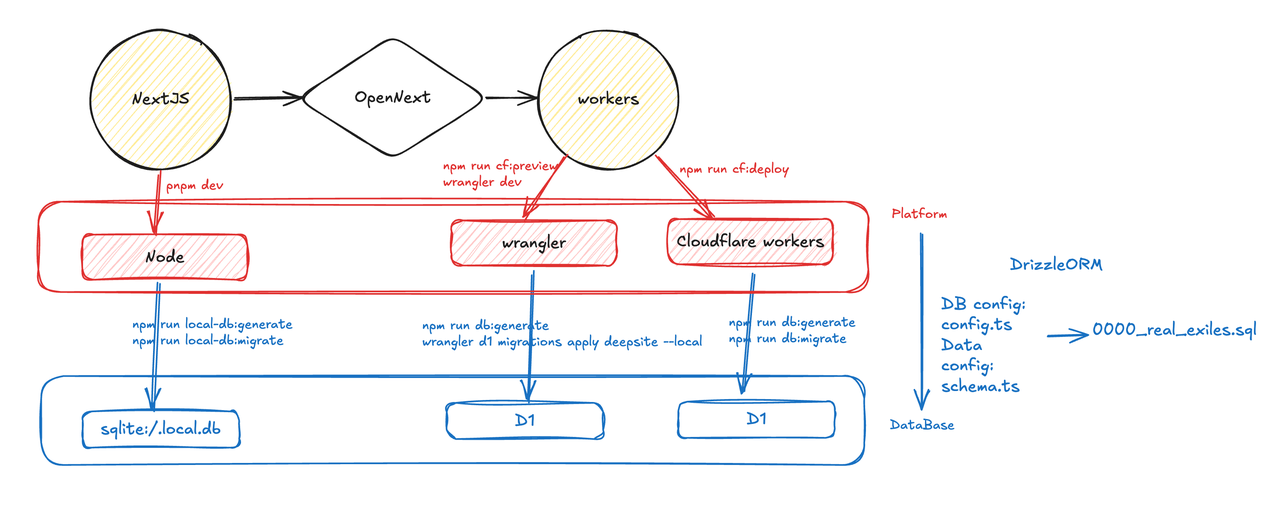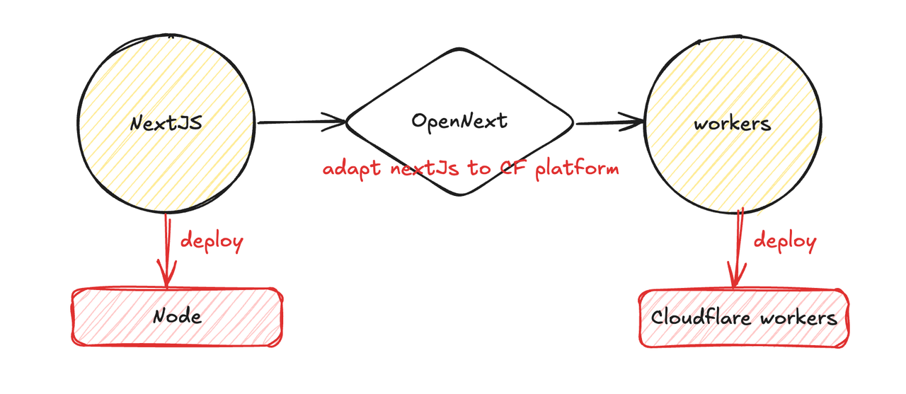 先看一下当前整体的部署方案,项目为了部署到CF pages/workers上,需要使用OpenNext将NextJS生成物转化成CF平台上的。
